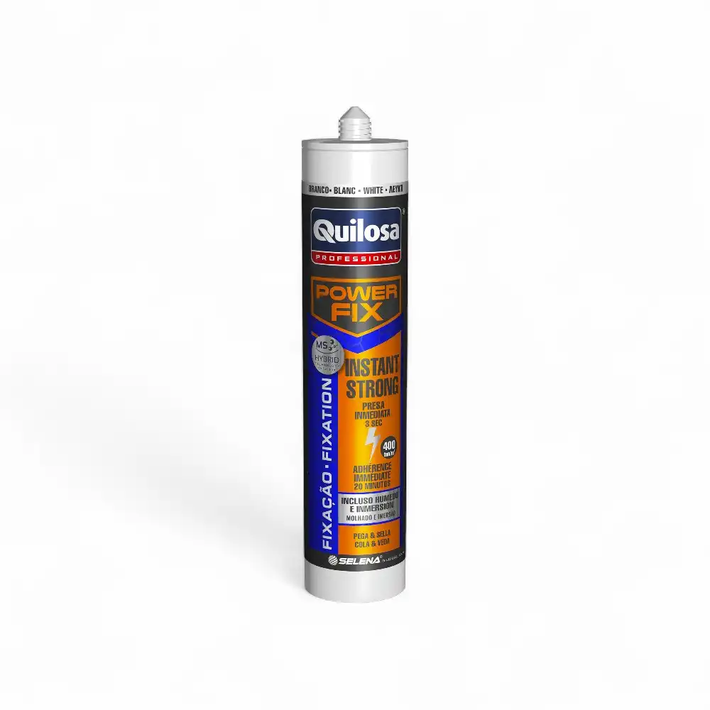 O Power Fix Instant Strong Branco 290 ml da marca Quilosa é um adesivo de montagem híbrido, cola & veda, pegajoso, de um componente, que alcança alta aderência rapidamente e um tempo de cura muito mais rápido do que as tecnologias tradicionais e em contato com a humidade (pode ser usado em superfícies húmidas). Não contém solventes, isocianatos ou água. É um produto universal com uma ampla gama de aplicações. Ideal para a colagem de concreto, rodapés, caixilhos de portas, madeira, cortiça, pedra, mármore, cerâmica, acessórios sanitários, tijolo, placas de isolamento, vidro, poliestireno, PVC, metal e espelhos. Não utilizar em PE, PP, Teflon e substratos betuminosos. É um produto seguro em superfícies delicadas, não enferruja metais nem danifica espelhos. É possível a utilização em interiores e exteriores. Com o Power Fix Instant Strong, obtém uma adesão rápida de todos os materiais, dos mais leves aos mais pesados. De fácil aplicação e aderência rápida, comprove a eficácia do Power Fix Instant Strong Branco 290 ml da Quilosa!